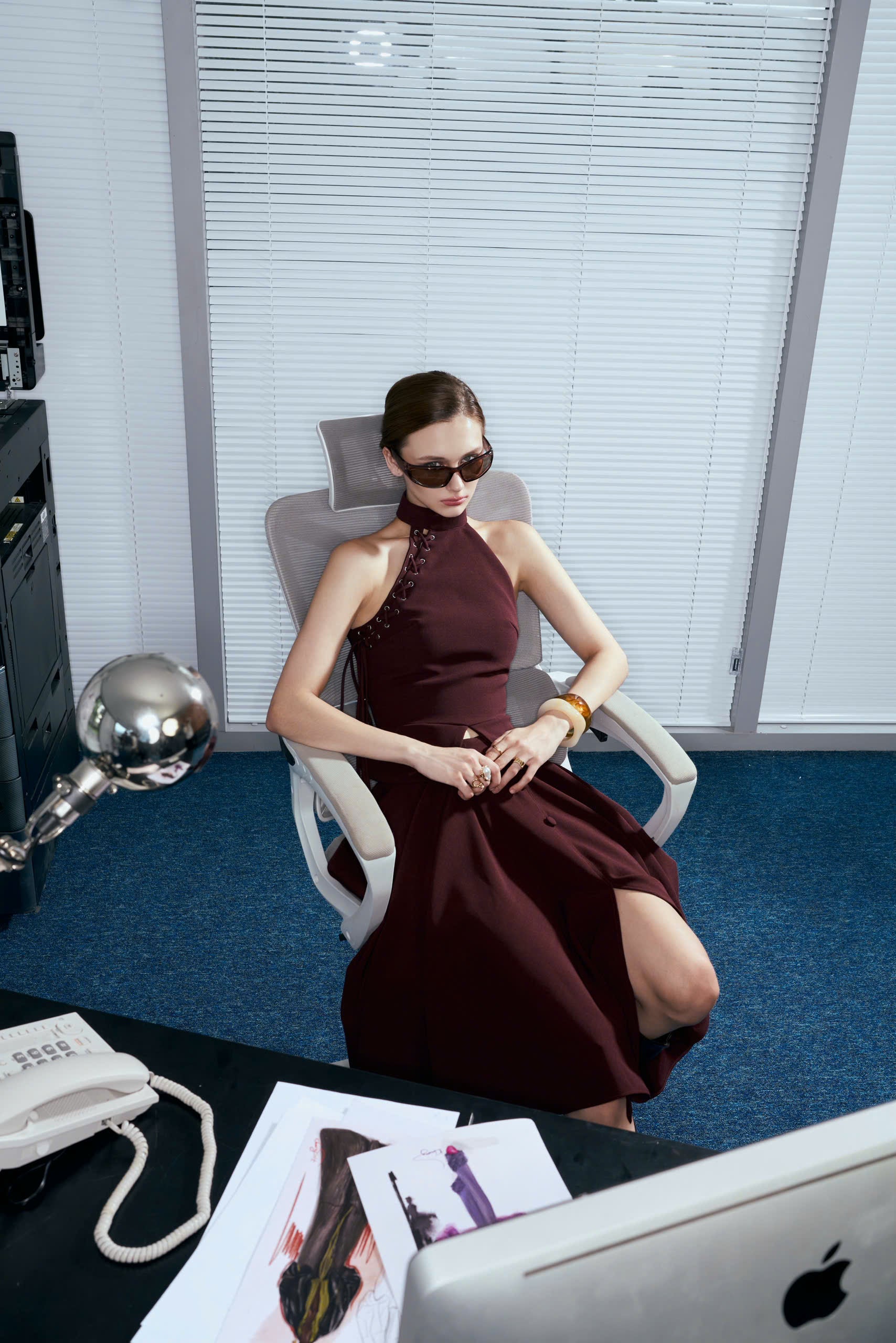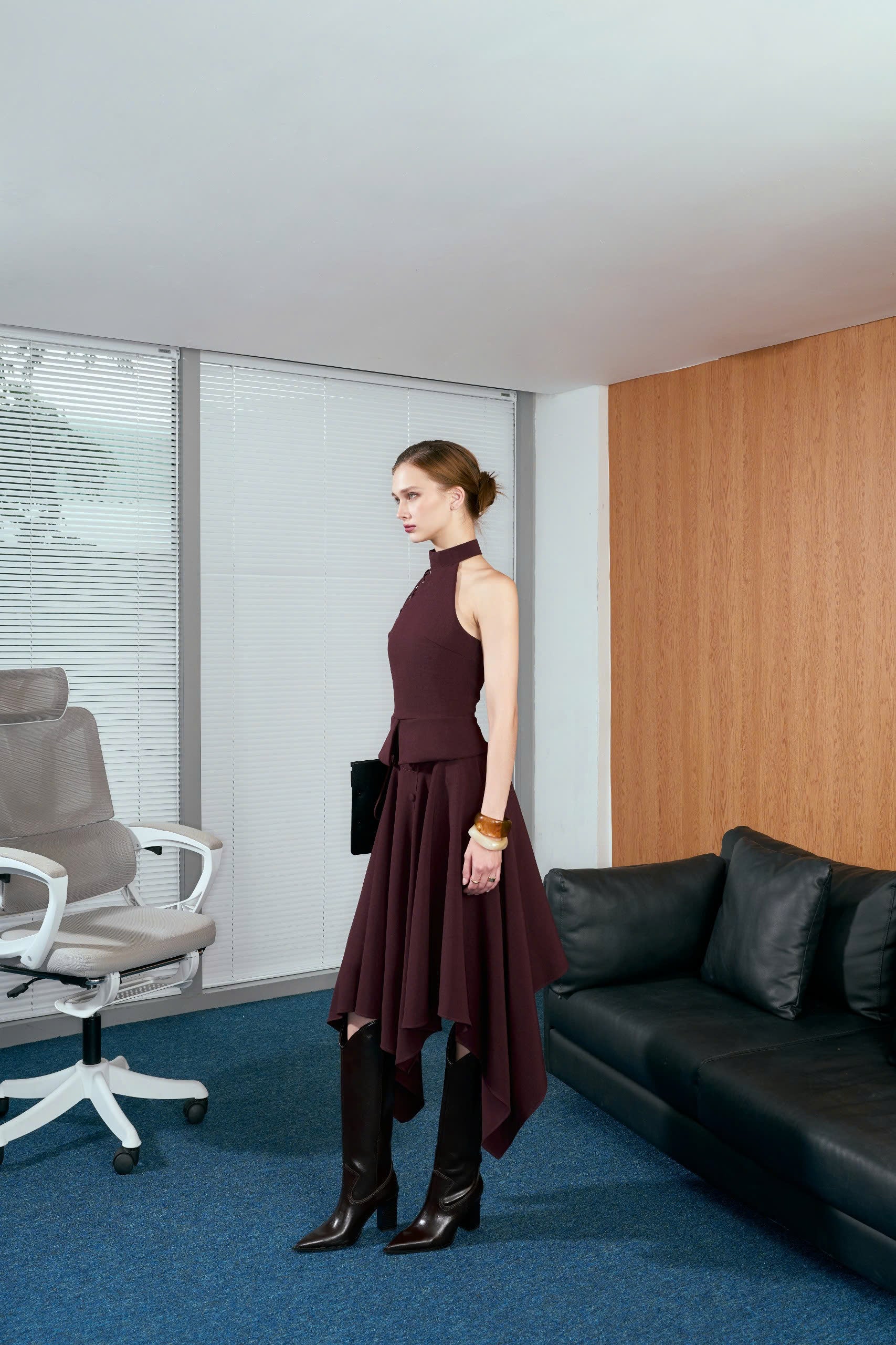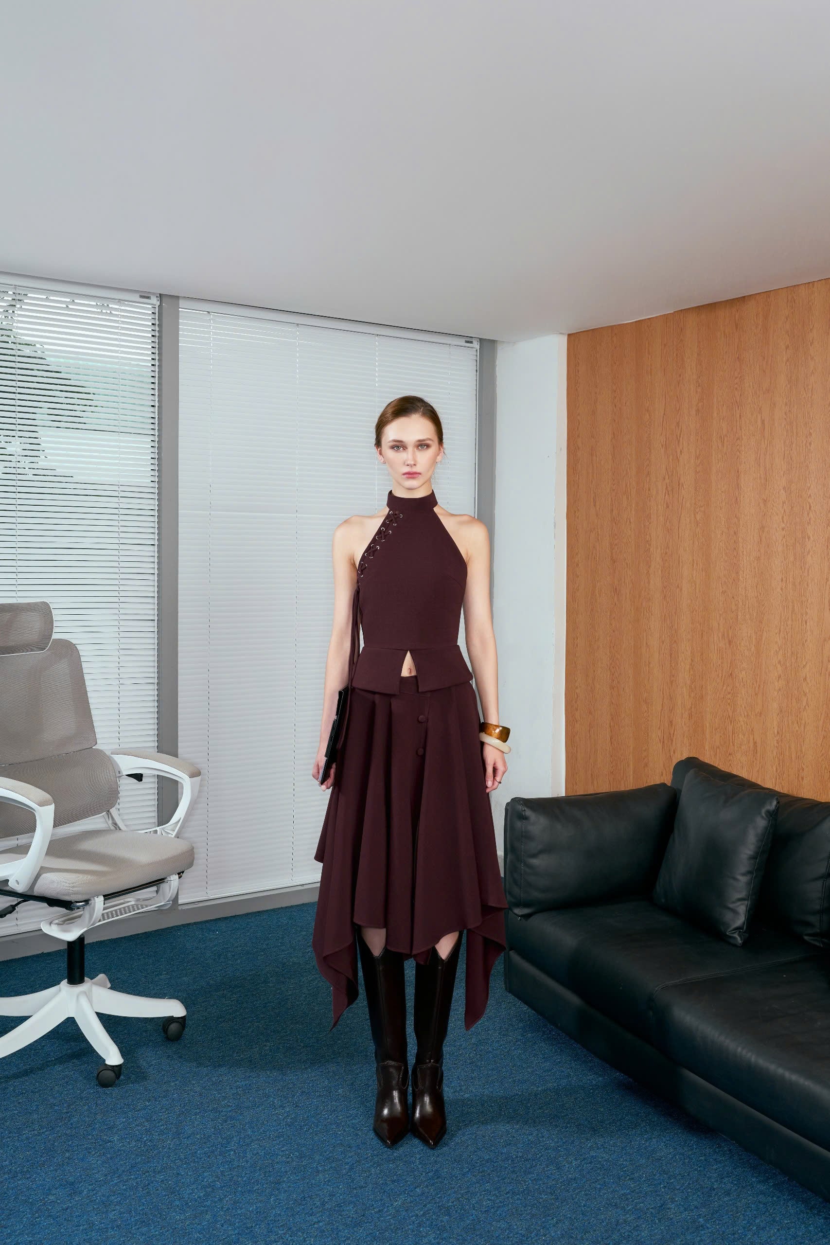 • Structured halter top with a lace-up neckline at one side, subtle front slit, and a neat peplum hem. Zip back. No padding.