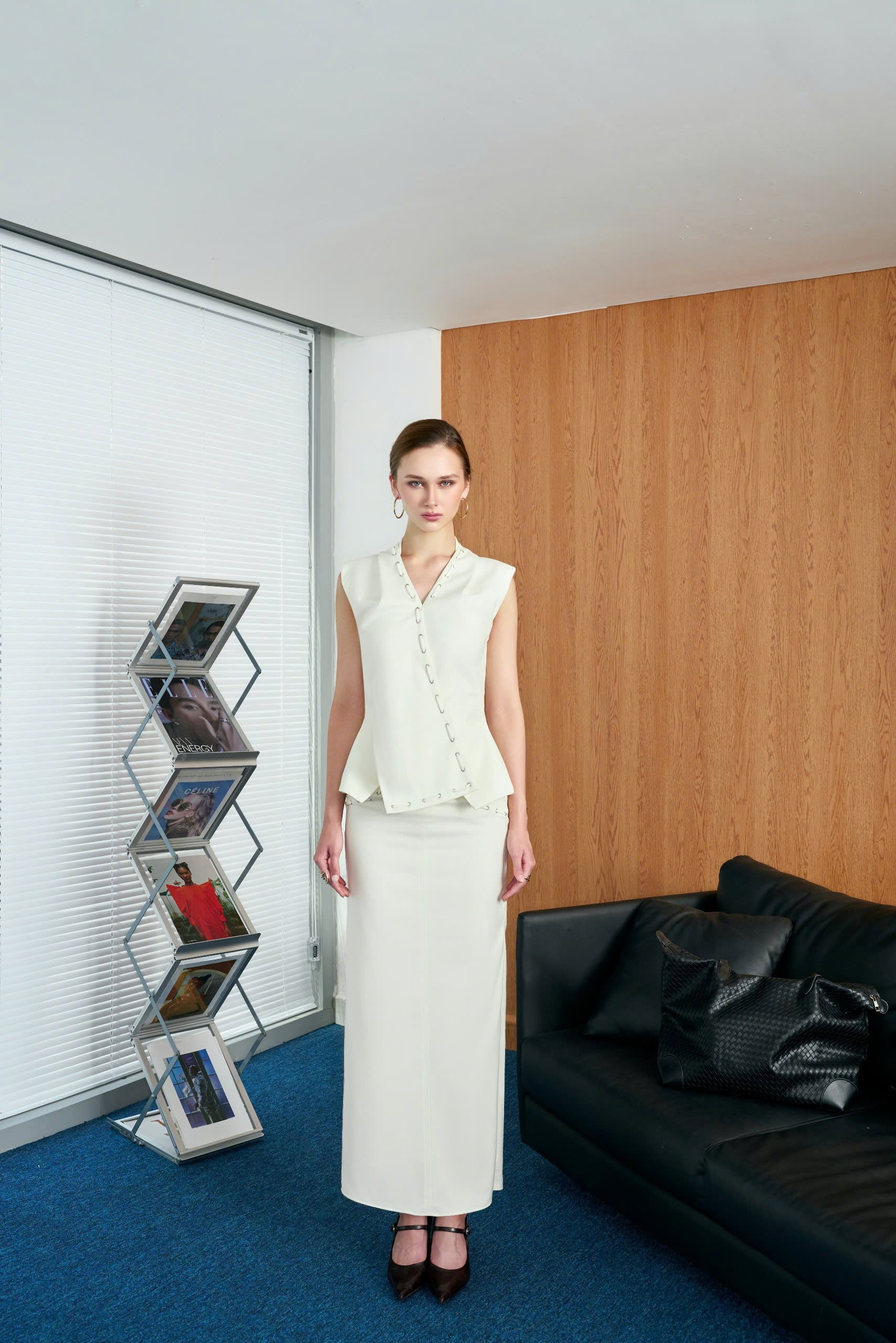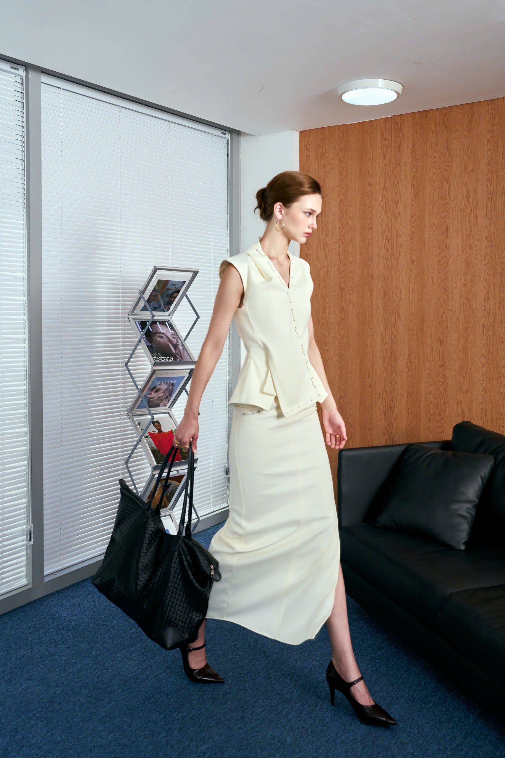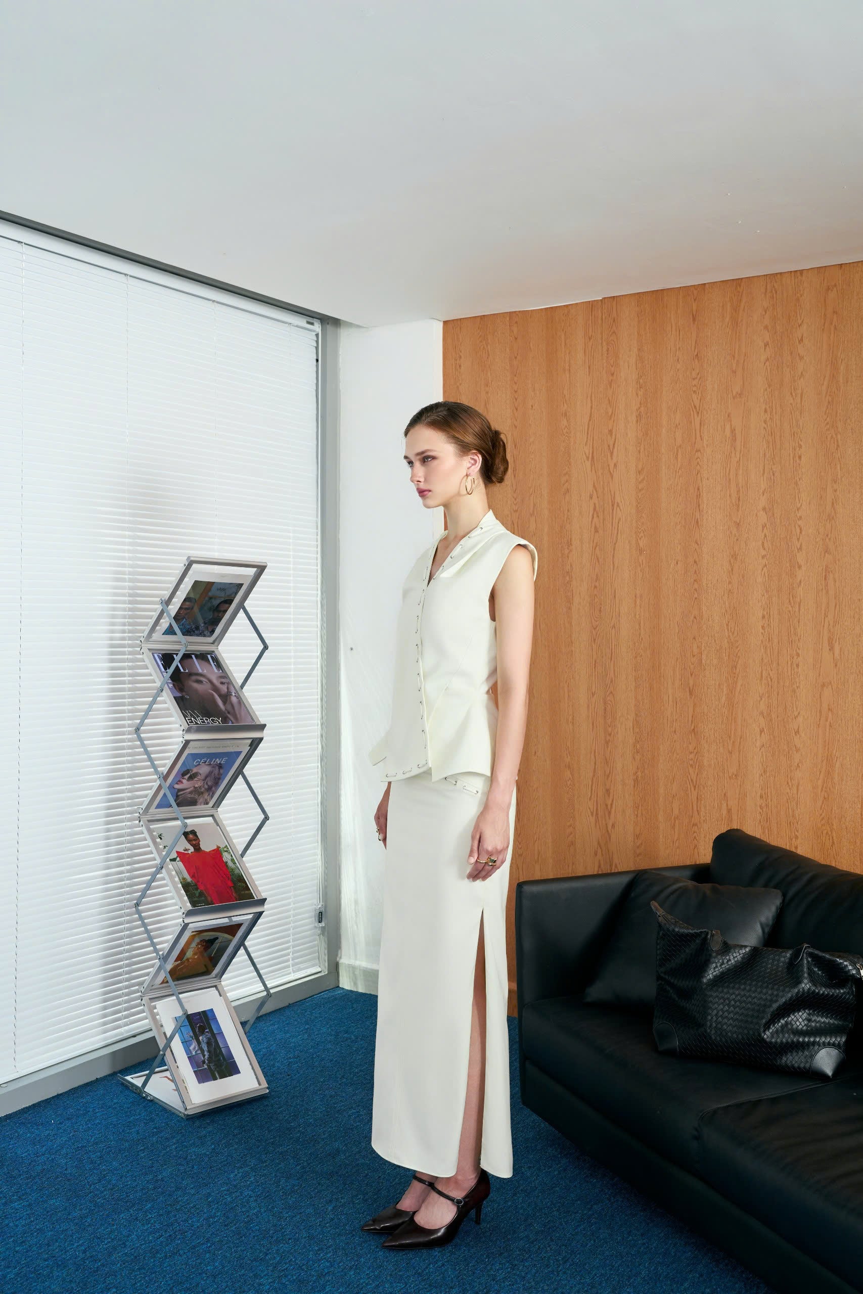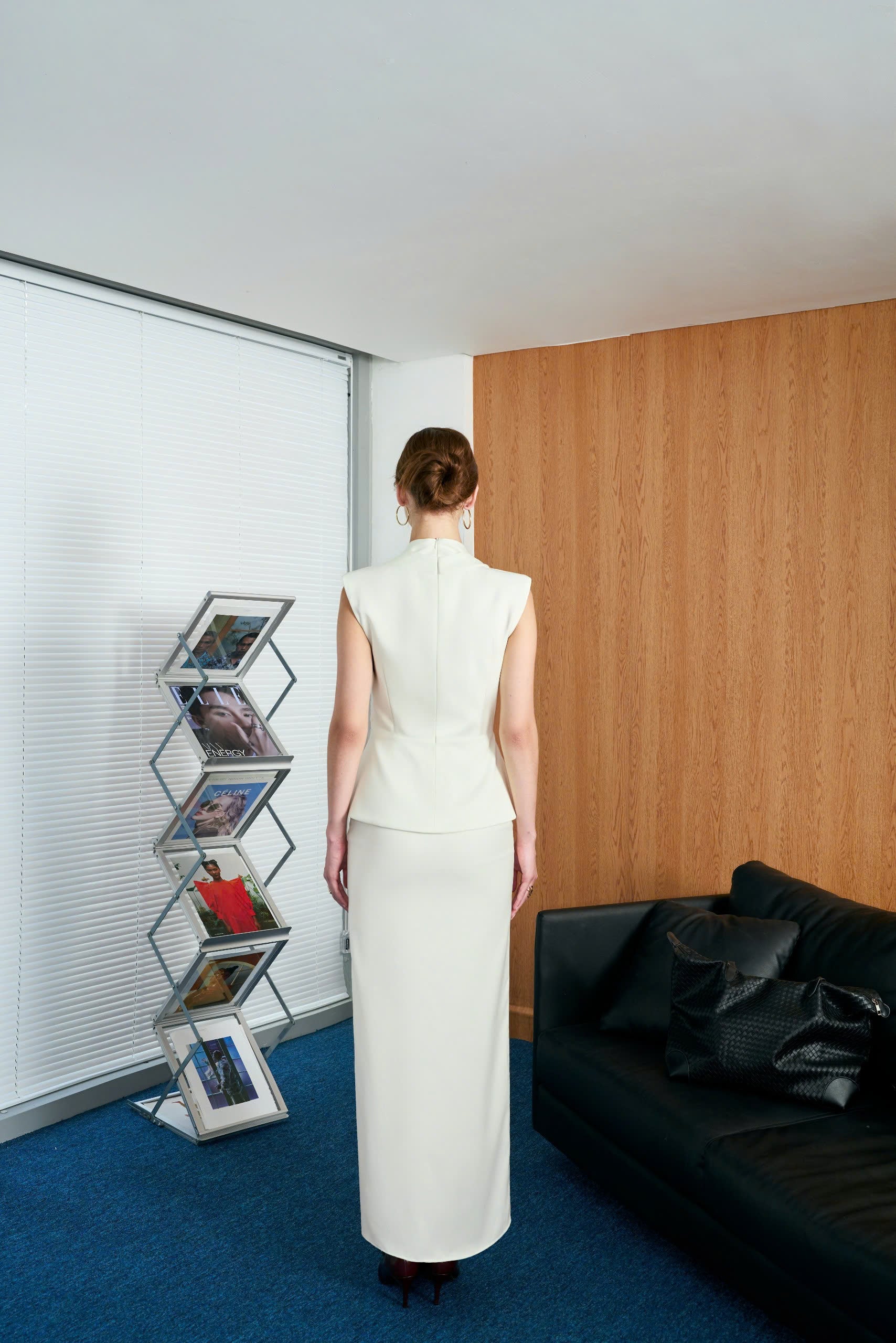 • A polished two-piece set with signature lacing on both top and skirt. Sculpted waist, column skirt with side slit, light shoulder padding for a clean straight shoulder line.