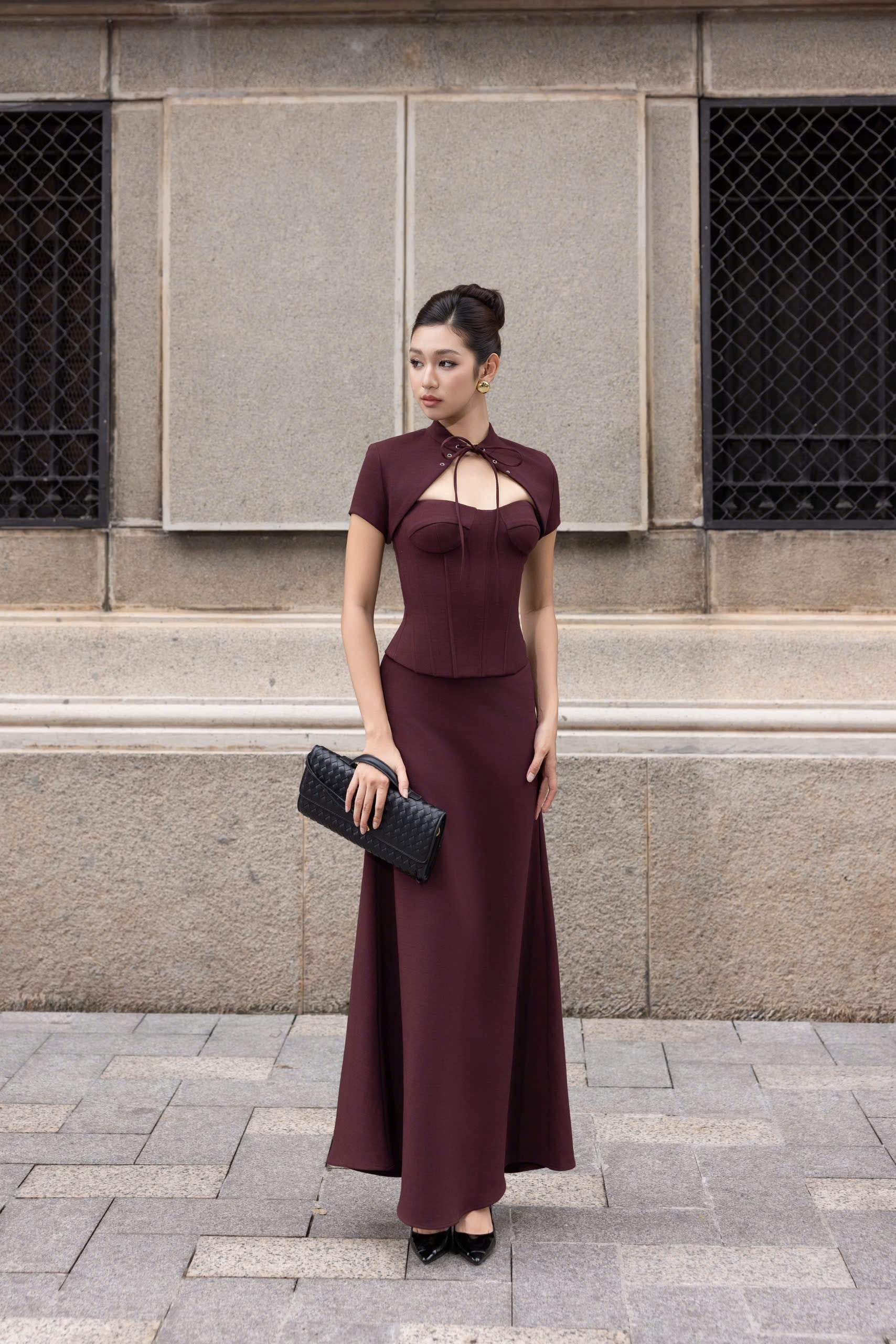 • A structured corset set in rich burgundy with a Keyhole Capelet Jacket. The corset has built-in padding and contour seaming for a sculpted, secure fit. Comes with a clean column maxi skirt.