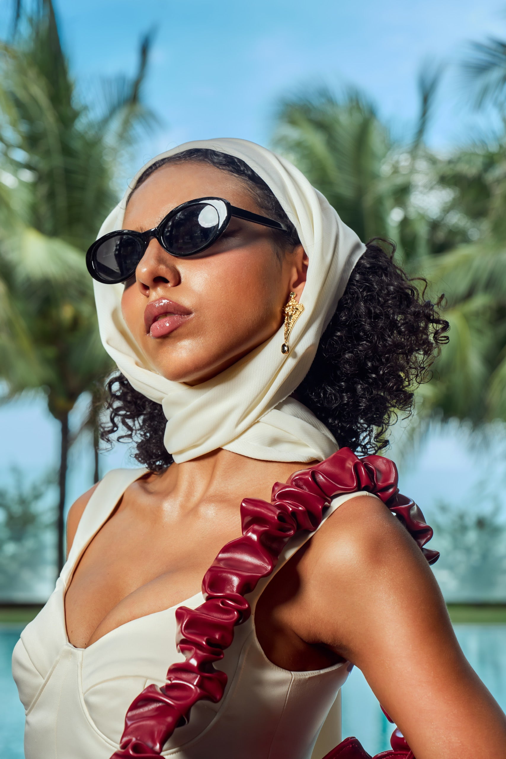 Style with a headscarf and sunglasses for a timeless, Riviera-inspired look. Step into the sun like you were born to be seen — soft angles, bare shoulders, and that perfect white glow.
