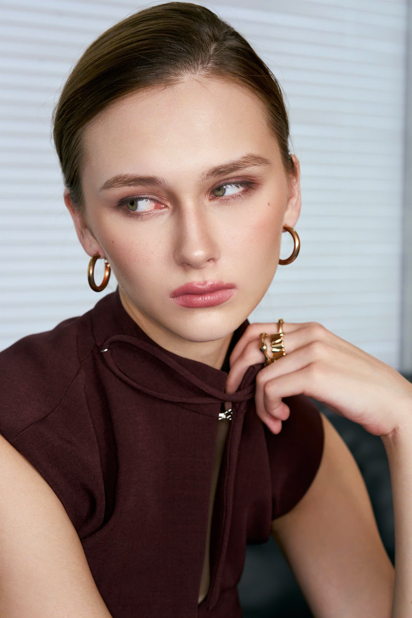 • Short capelet with a mock neck and clean front keyhole. Minimal neck closure for a neat, modern finish.
