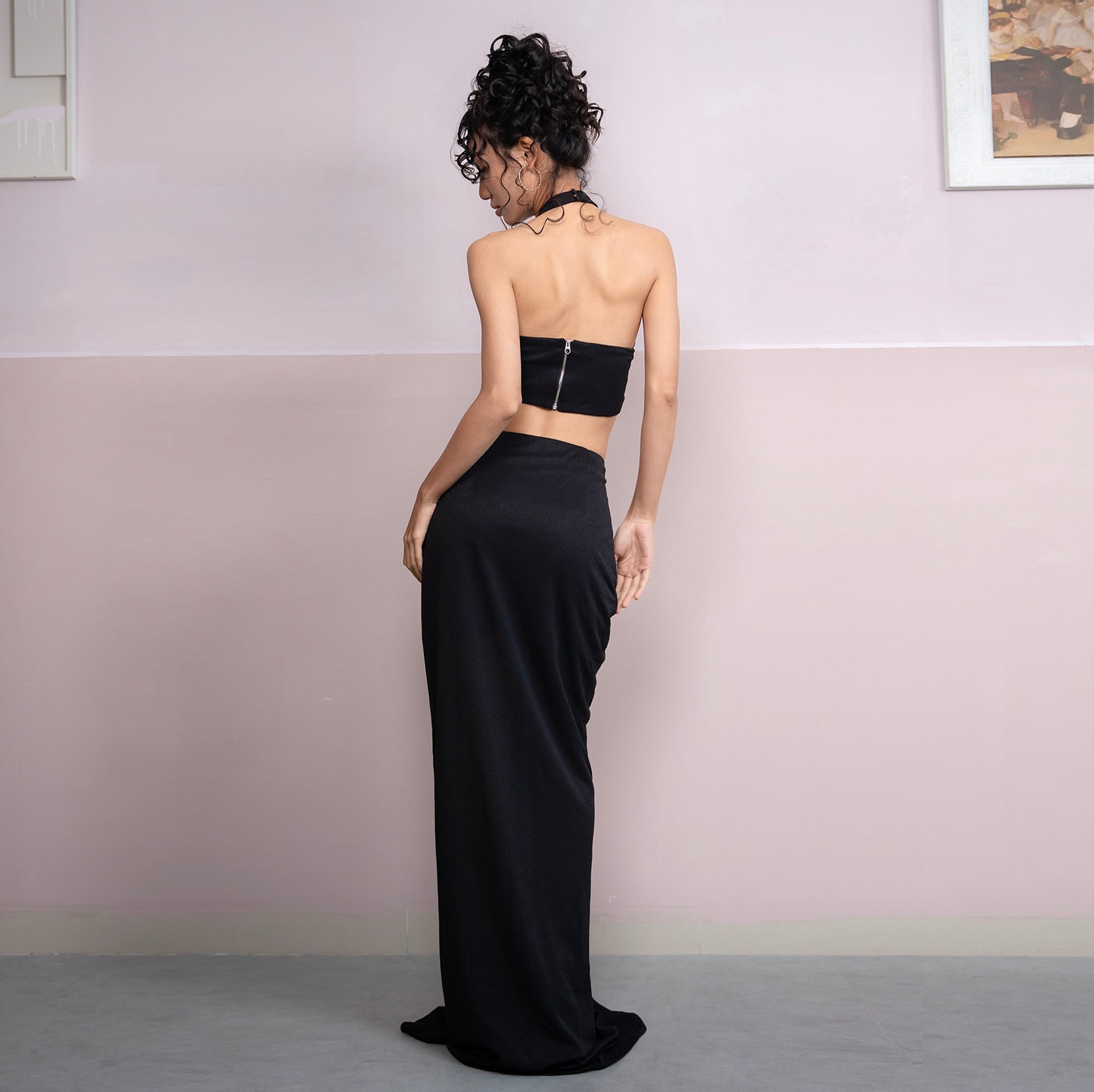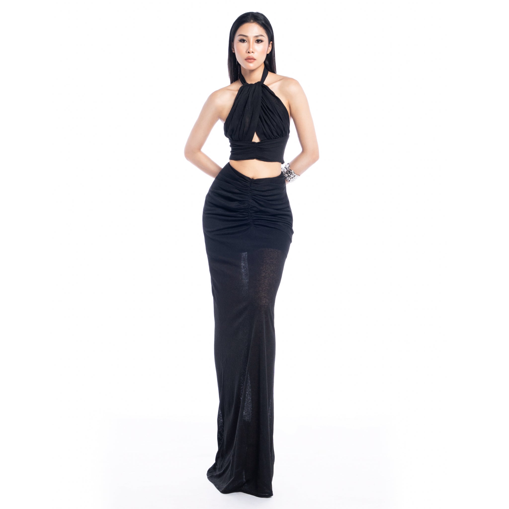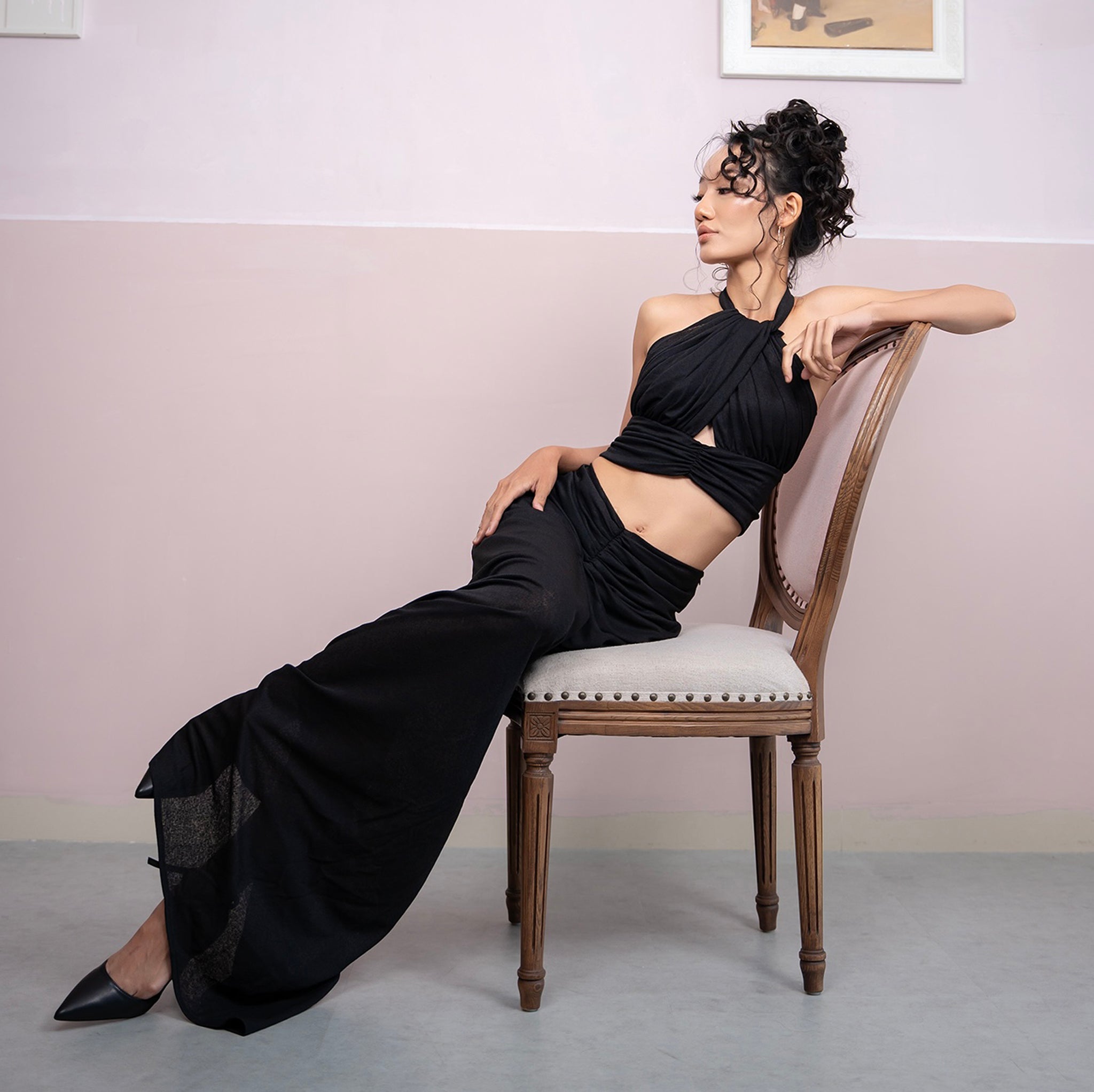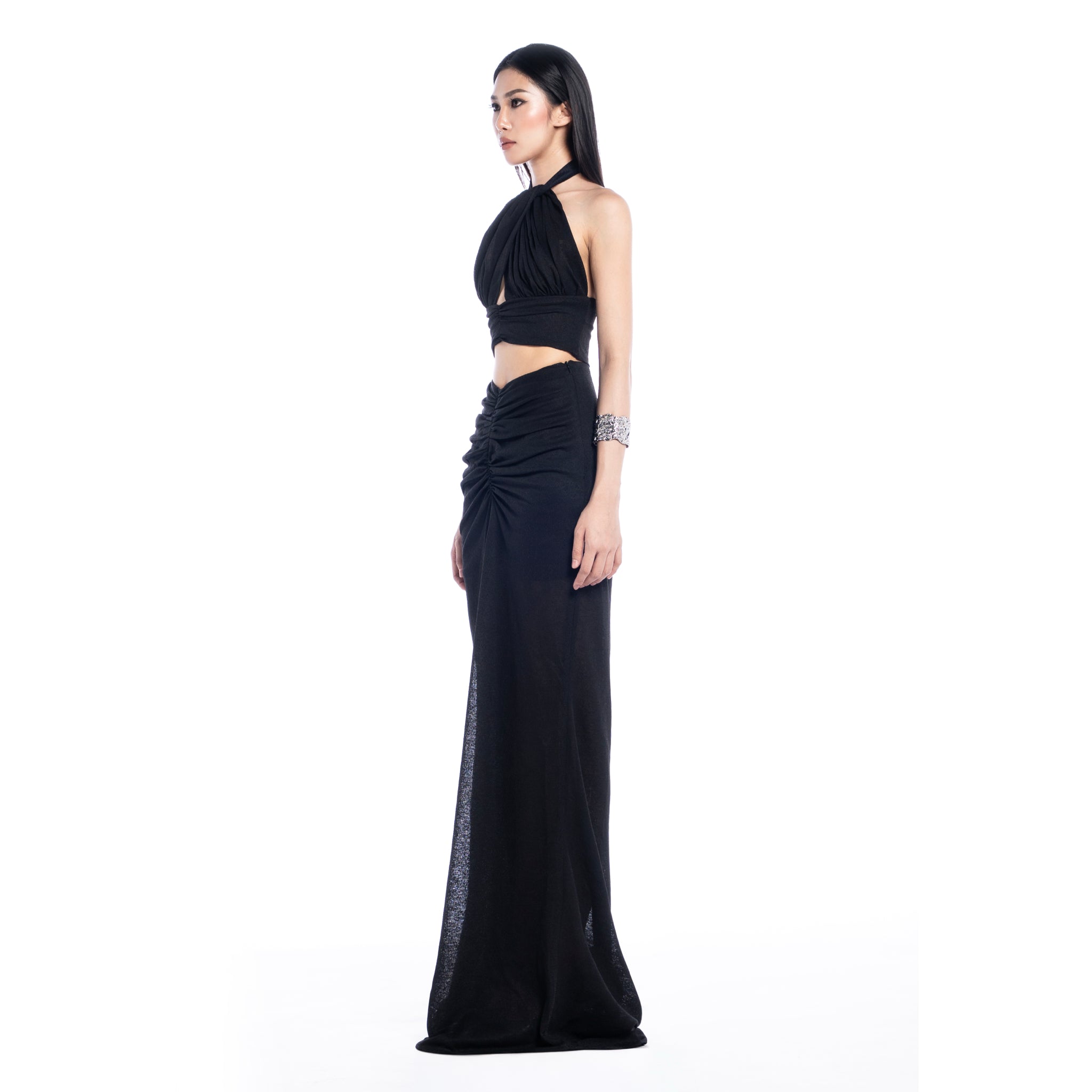This subtly textured knit fabric offers a soft matte sheen and just the right amount of stretch. Lightweight and breathable, it contours the body without clinging, creating elegant drapes and flattering lines in every step.